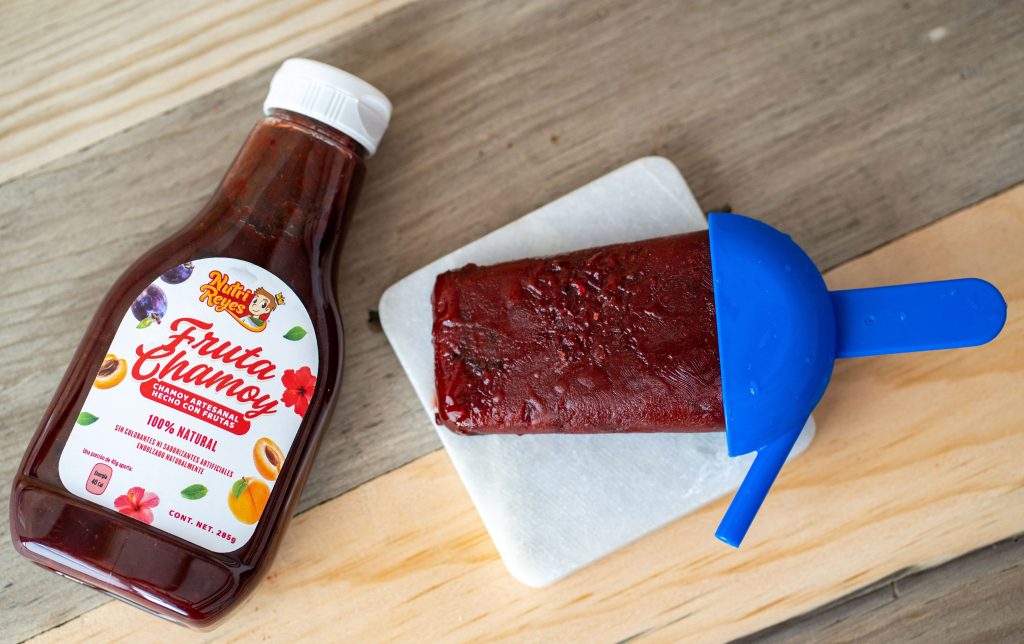 5. ¡Agrega chilito al gusto y disfruta! Un bote de Frutachamoy 285g rinde para 6 paletas de 40 ml.
